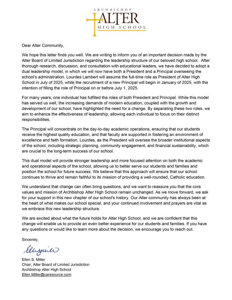 Subject to the reserved rights and powers of the Archbishop of Cincinnati, the Board is established to act as a decision-making group, responsible for the governance of Alter High School in the best interests of the School, its stakeholders and the Archdiocese.